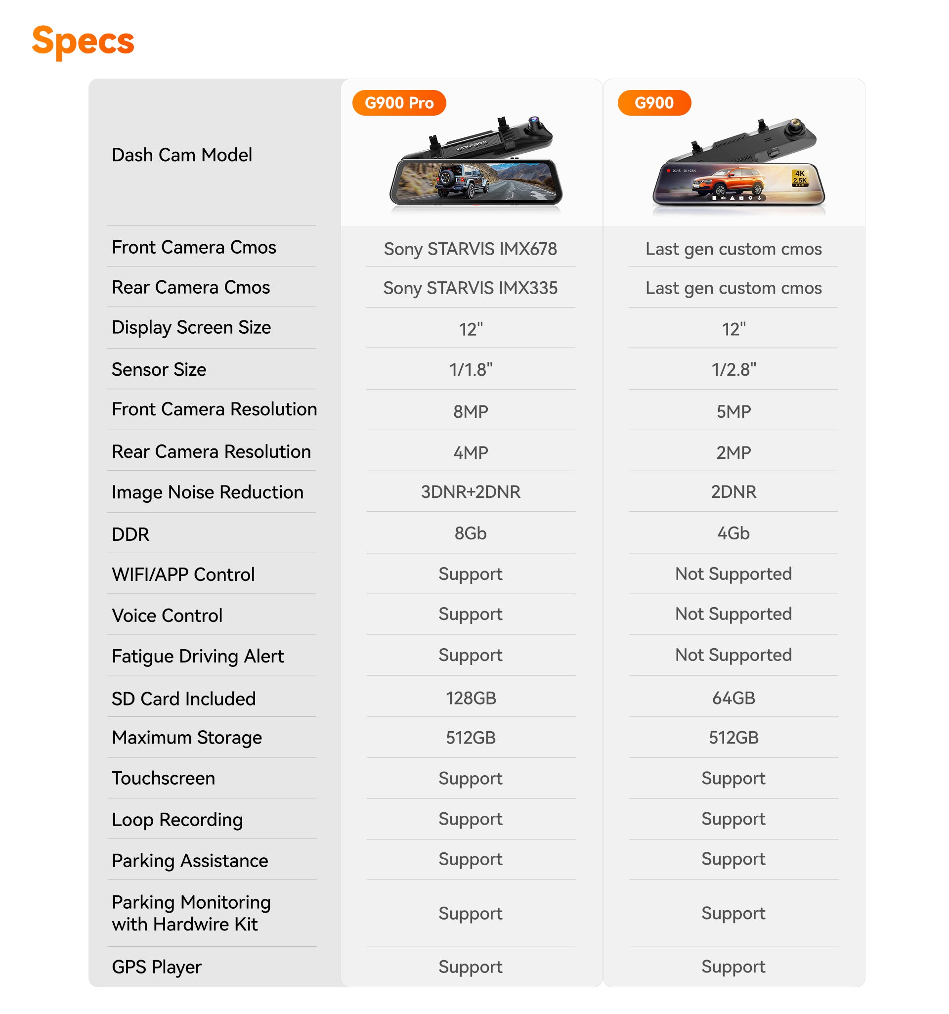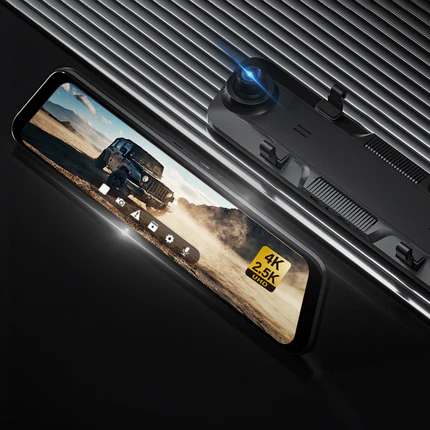 - Get the ultimate driving experience with G900 4K+2.5K dashcam featuring a large touchscreen display and rear view mirror cameras.
